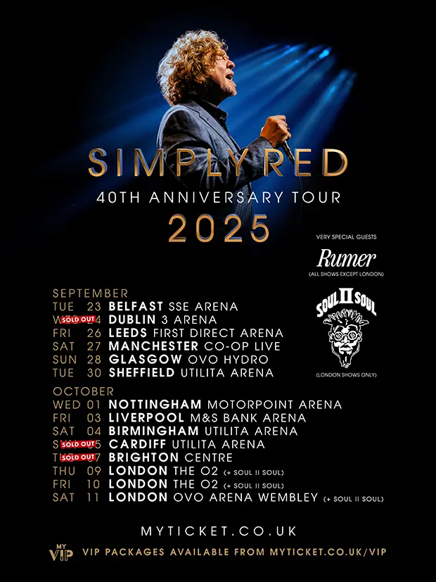 Simply Red is an English soul and pop band formed in Manchester in 1985. Band leader, singer and songwriter Mick Hucknall was the only original member left by the time Simply Red initially disbanded in 2010. They have released thirteen studio albums, from Picture Book (1985) through Time (2023), all of which have peaked within the top ten on the UK Albums Chart; with the albums A New Flame (1989), Stars (1991), Life (1995) and Blue (1998), along with their Greatest Hits (1996) album, reaching number one. Their 1991 album Stars is one of the best-selling albums in the United Kingdom. The group released ten songs that have reached the top 10 on the UK Singles Chart, including "Stars", the Fugees-assisted "Angel", "The Air That I Breathe" and "Sunrise", with the single "Fairground" peaking atop the UK Singles Chart. Their singles "Holding Back the Years" and "If You Don't Know Me by Now" both reached number one on the US Billboard Hot 100. At the 1992 and 1993 Brit Awards, they received the award for Best British Group. They have received three Grammy Award nominations, including one for Best New Artist in 1987. Their version of "If You Don't Know Me by Now" won songwriters Kenny Gamble and Leon Huff the Grammy Award for the Best R&B Song. The band re-formed in 2015. Simply Red have sold over 50 million albums. Discography Picture Book (1985) Men and Women (1987) A New Flame (1989) Stars (1991) Life (1995) Blue (1998) Love and the Russian Winter (1999) Home (2003) Simplified (2005) Stay (2007) Big Love (2015) Blue Eyed Soul (2019) Time (2023) User-contributed text is available under the Creative Commons By-SA License; additional terms may apply.